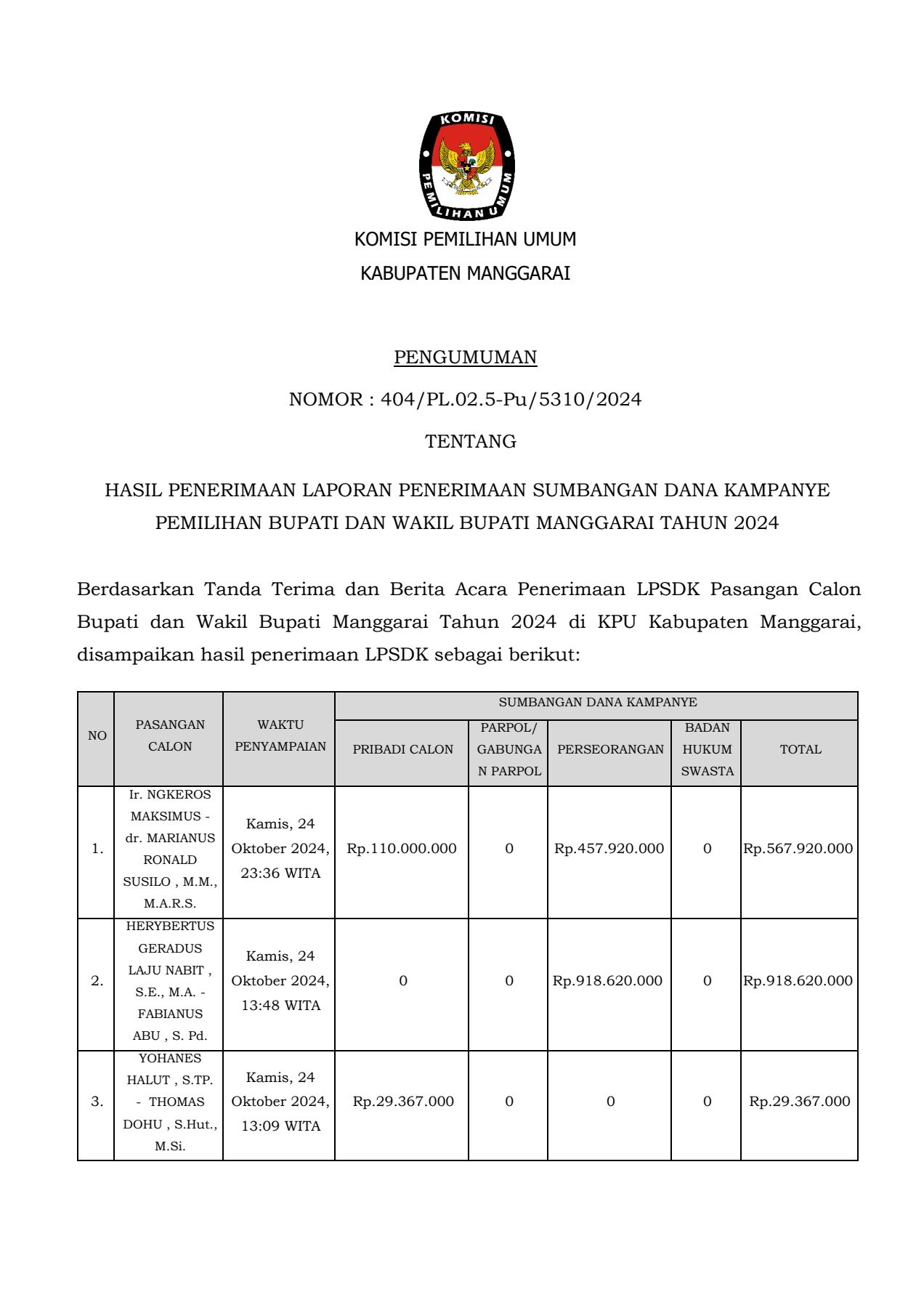 Pengumuman ini adalah Pengumuman Laporan Penerimaan Sumbangan Dana Kampanye pada Pemilihan Bupati dan Wakil Bupati Manggarai Tahun 2024. Klik pada tautan untuk mendownload: https://kab-manggarai.kpu.go.id/public/kab-manggarai/dmdocument/1729915368PENGUMUMAN LPSDK.pdf....