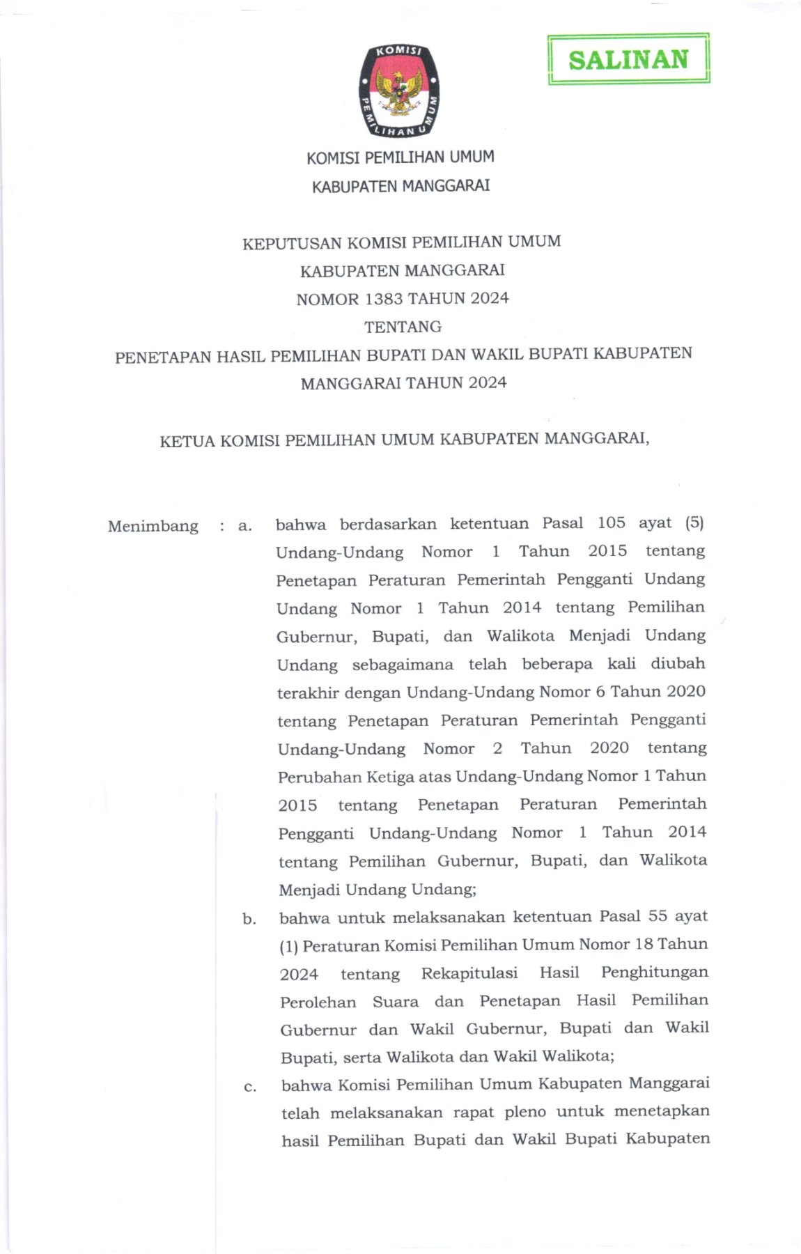 Salinan Keputusan KPU Kabupaten Manggarai Nomor 1383 Tahun 2024