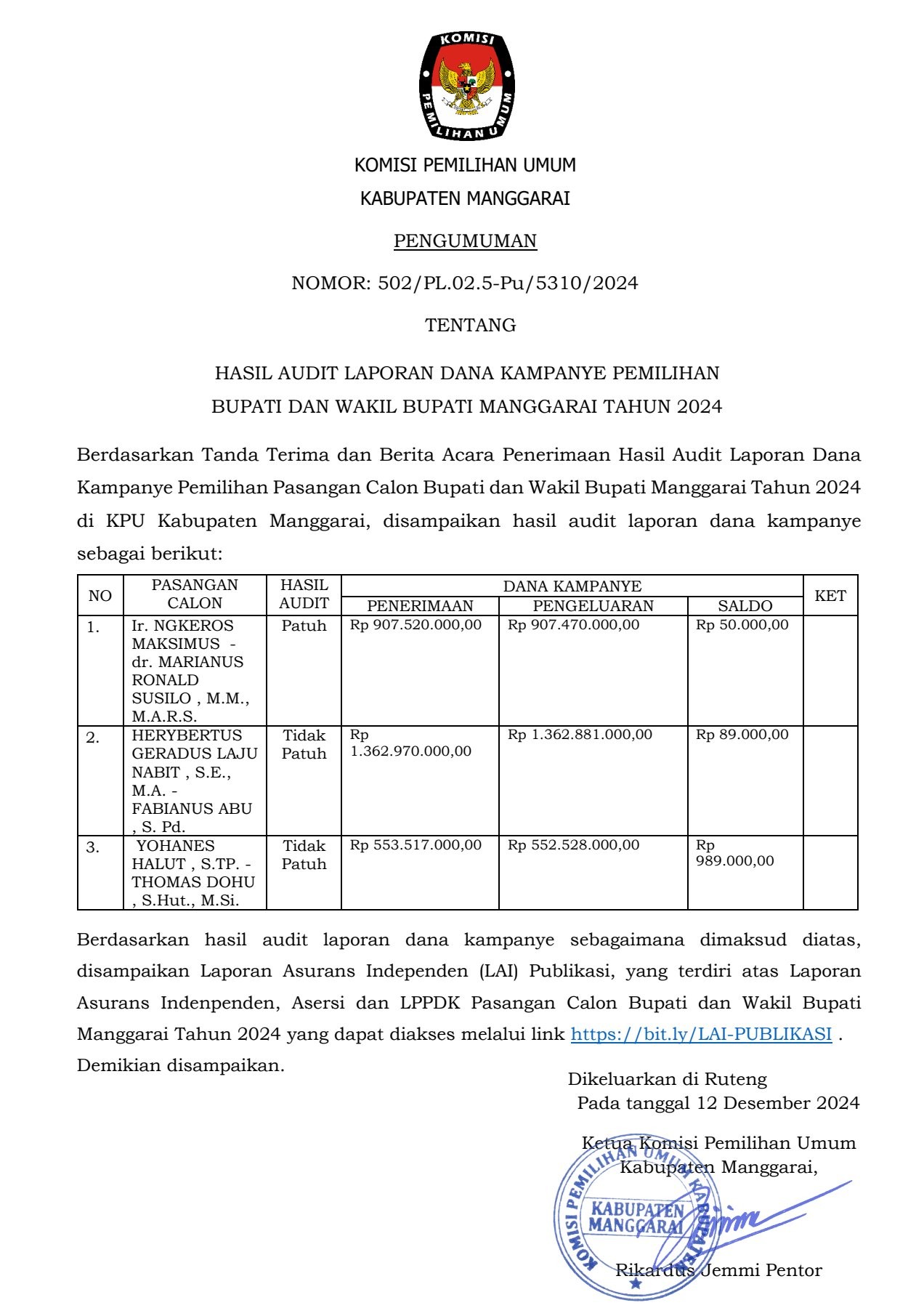 Pengumuman ini merupakan Pengumuman Hasil Audit Dana Kampanye Pemilihan Bupati Dan Wakil Bupati Manggarai Tahun 2024. Download Pengumuman melalui tautan berikut: https://kab-manggarai.kpu.go.id/public/kab-manggarai/dmdocument/1733978338PENGUMUMAN HASIL AUDIT.pdf....