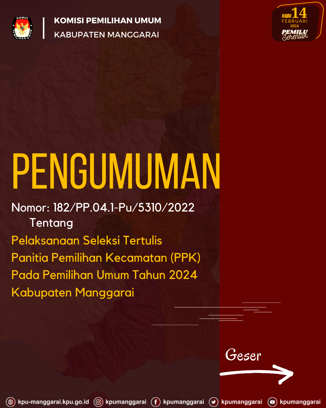 https://kab-manggarai.kpu.go.id/public/kab-manggarai/dmdocument/1670160764PENGUMUMAN 182 TENTANG PELAKSANAAN SELEKSI TERTULIS PPK.pdf