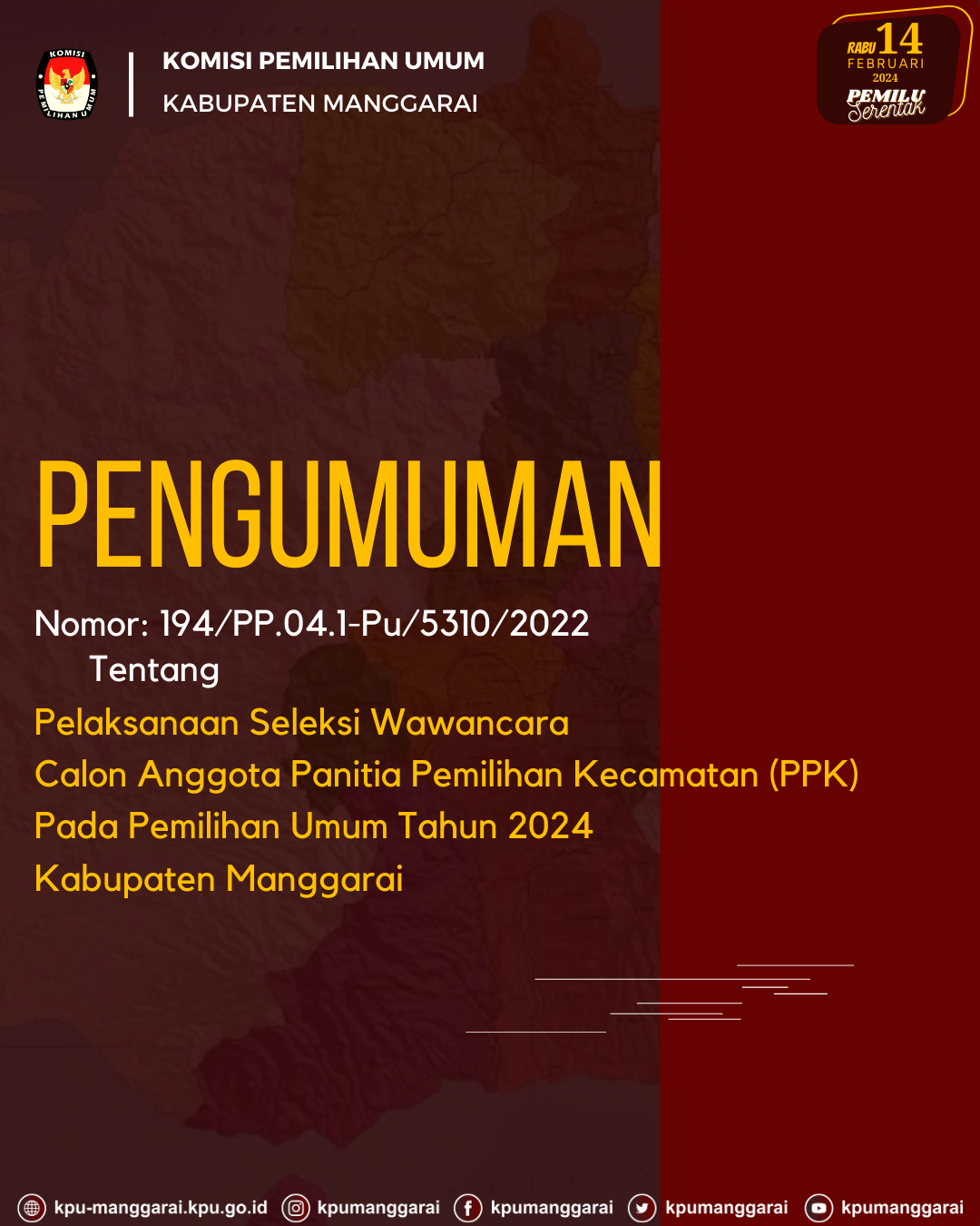 https://kab-manggarai.kpu.go.id/public/kab-manggarai/dmdocument/1670583464PENGUMUMAN NOMOR 194 TENTANG PELAKSANAAN WAWANCARA CALON PPK PEMILIHAN UMUM 2024.pdf