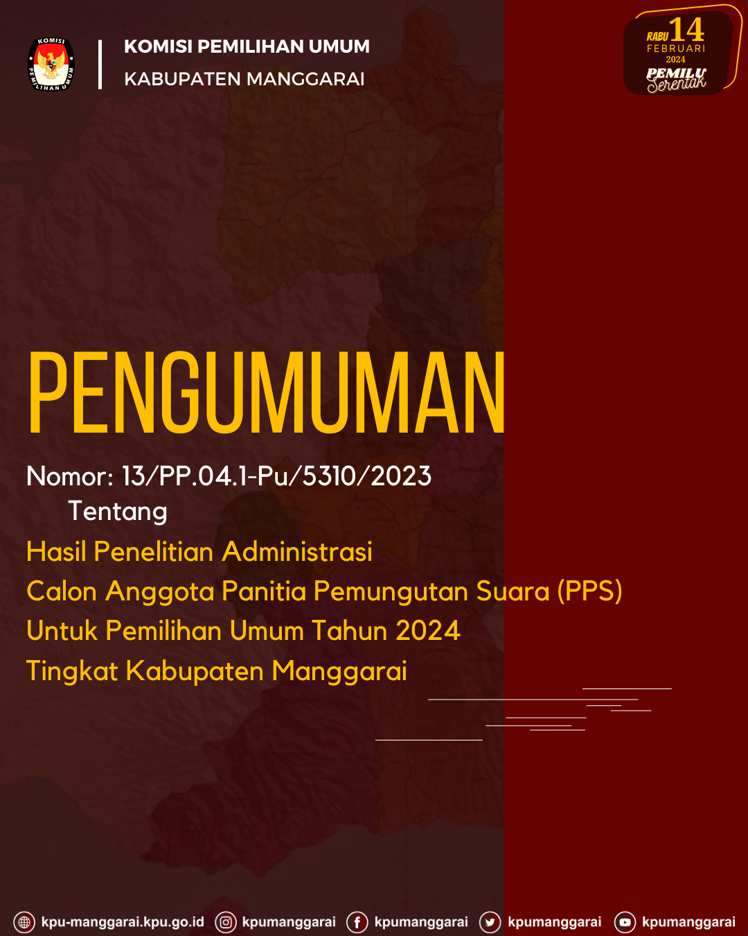 https://kab-manggarai.kpu.go.id/public/kab-manggarai/dmdocument/1673005606PENGUMUMAN NOMOR 13_PP.04.1_Pu_5310_2023 TENTANG HASIL SELEKSI ADMINISTRASI CALON PPS PEMILU 2024.pdf