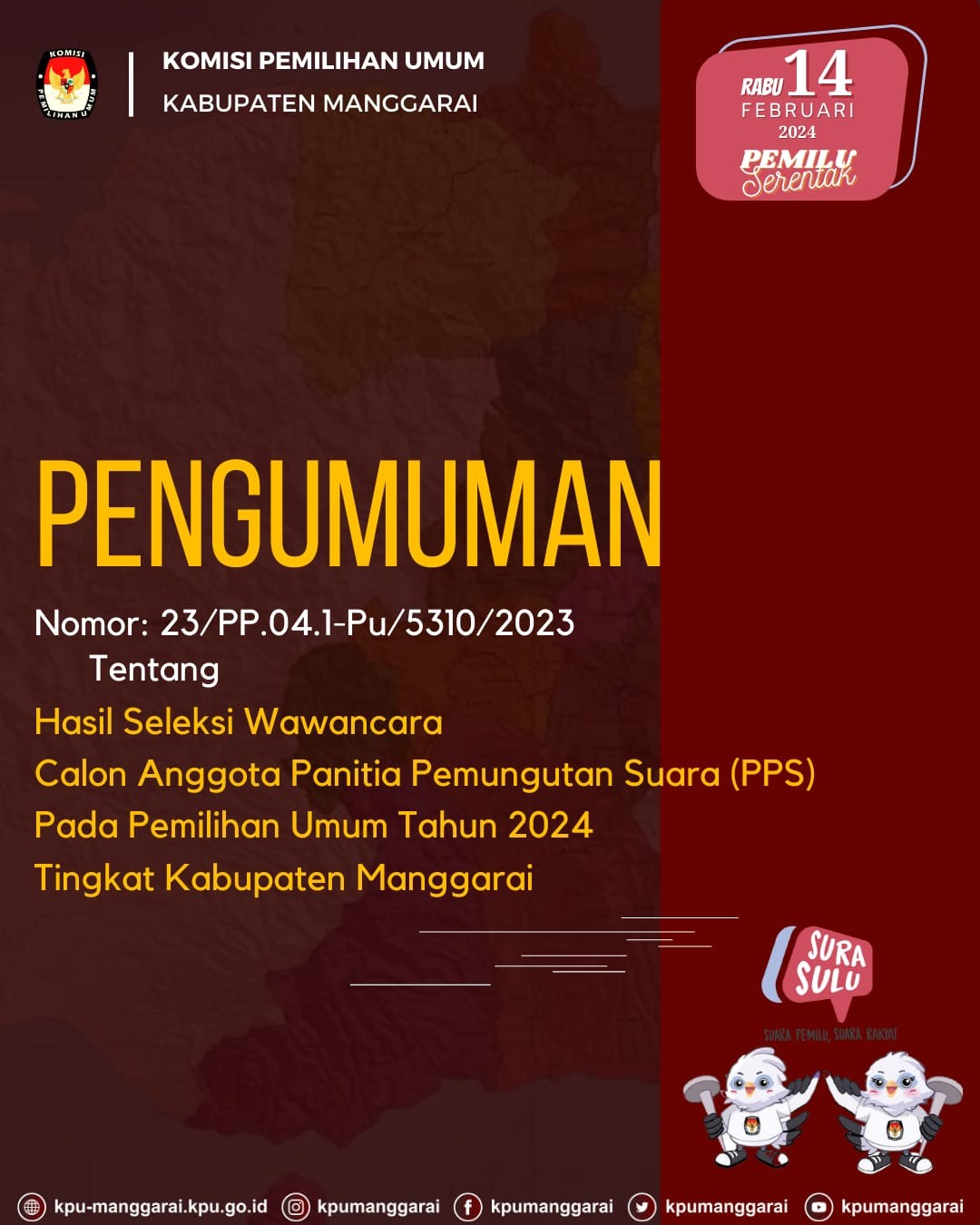 https://kab-manggarai.kpu.go.id/public/kab-manggarai/dmdocument/1674397045PENGUMUMAN NOMOR 23 TAHUN 2023 TENTANG HASIL WAWANCARA CALON ANGGOTA PPS PEMILU 2024.pdf